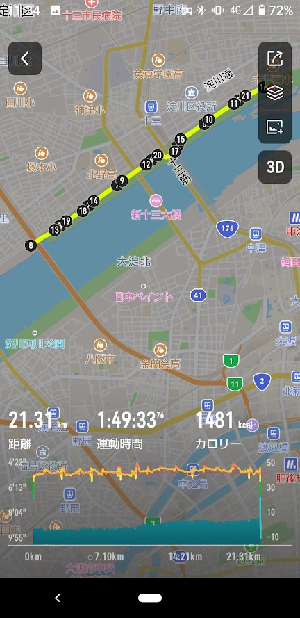 ・当初予定していたレース展開を守れなかったは反省。しかし途中から一気にペースを上げてタイムを短縮する難しさがわかったのは収穫。フル本番では最低でも35kmぐらいまでは一定ペースを刻むことを決意。現時点の目標タイムは3時間45分。