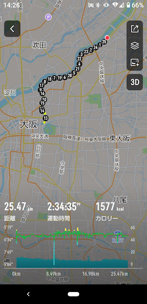 ・自己最長距離の25km走に挑戦。途中めっちゃ足が重くてきつかったけど、なんとか耐えながら走れた。意外と足が重くても呼吸が楽ならペースを維持できると実感。